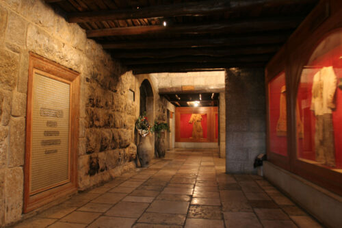 اللّوحة الـيُمنى: يوسف في بيته الأبوي يشارك والدته الصلاة أمام صورة العذراء مريم والمصلوب.