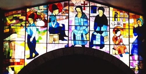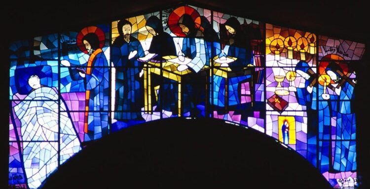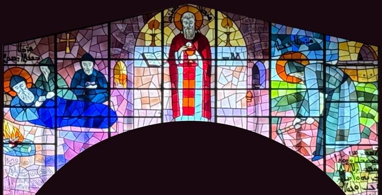 من زجاجيات الأب عبدو بدوي وتتضمّن رسمًا لمحبسة القدّيسَين بطرس وبولس حيث استحبس مار شربل.