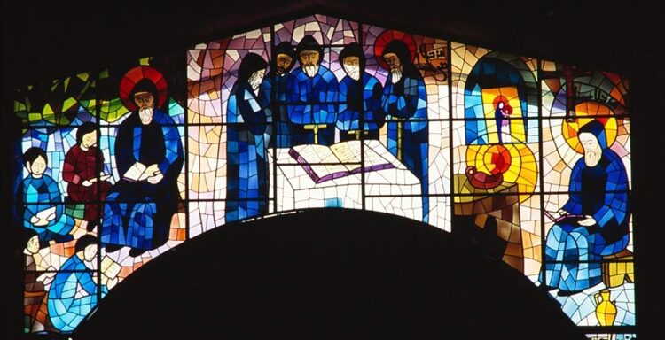 اللّوحة الوسطى: شربل يدرس اللاهوت على يد معلّمه مار نعمة الله الحرديني.