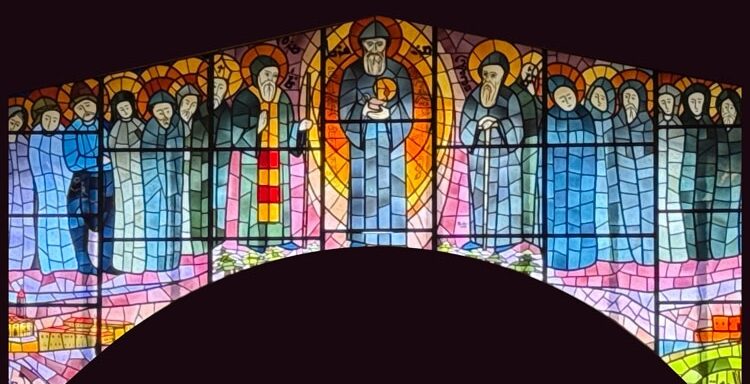 من زجاجيات الأب عبدو بدوي وتـتضمّن رسمًا لوجه القدّيس شربل.